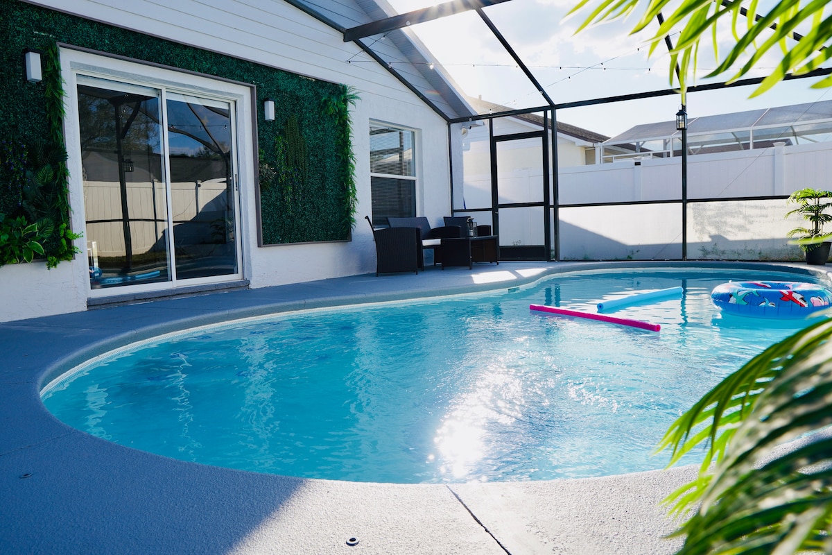 Bem-vindo ao seu refúgio moderno em Kissimmee! A apenas 15 minutos do Aeroporto Internacional de Orlando, esta casa de 3 quartos e 2 banheiros lindamente renovada oferece a mistura perfeita de conforto e luxo. Cada detalhe foi cuidadosamente atualizado - desde a nova cozinha e banheiros tipo spa até a área da piscina privativa intocada - garantindo uma estadia relaxante. Com acomodações para até 9 hóspedes em 6 camas, há muito espaço para relaxar.