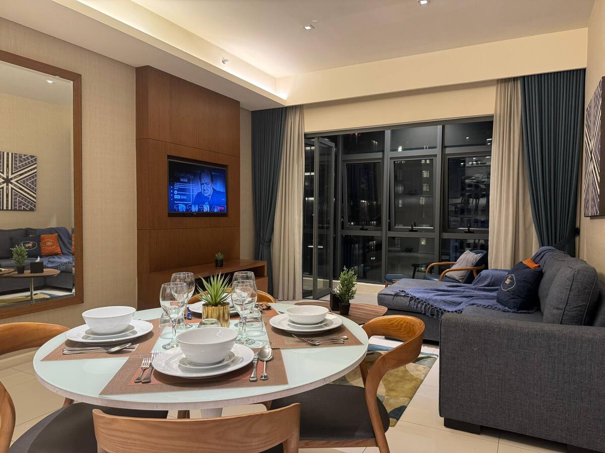 Por que ficar no The Beachin Suite at Lucentia Residence -plomecidamente decorado com um espírito divertido -centralmente localizado - Perto de transportes públicos Wi-Fi rápido -2 TVs com Netflix, Apple TV, Prime Video -2 piscinas deslumbrantes -familiar com berço e cadeira alta - academia, mesa de bilhar, churrasqueiras, piano - Estacionamento em garagem - Recomendado para 4 pessoas, capacidade máxima para 6 -LalaPort Shopping Mall & the WOW Entertainment street below -groceria, farmácia e muitos restaurantes estão anexados - teatro de filmes GSC ao lado