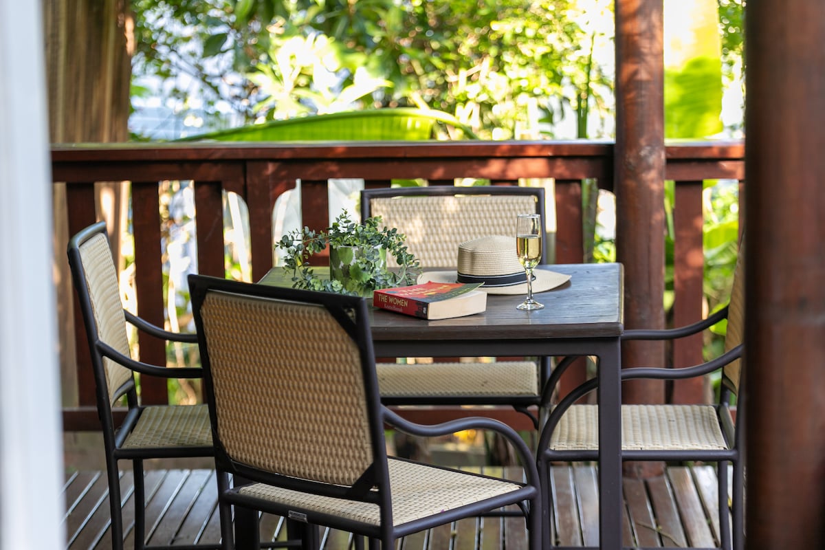 Lagoon Classic: A single-storey cottage with veranda, living room, kitchen, and one double en-suite bedroom with king bed. The bathroom contains a shower/bath combination. Adjacent covered parking overlooking the swimming pool. Smart TV.