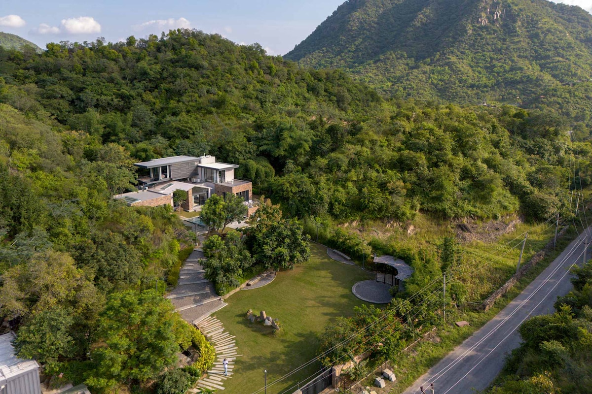 Vila serena com piscina, jardim e vista para a colina de Aravali