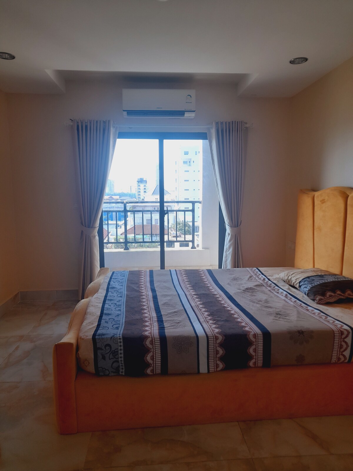 This modern condo is located in the heart of Phnom Penh, offering the perfect blend of convenience and luxury. The condo also includes a private balcony with stunning city views. Guests can enjoy premium amenities such as a rooftop pool, fitness center, 24-hour security, and secure parking. Its central location places you within walking distance of shopping centers, restaurants, and cultural landmarks, making it an excellent choice for visitors.