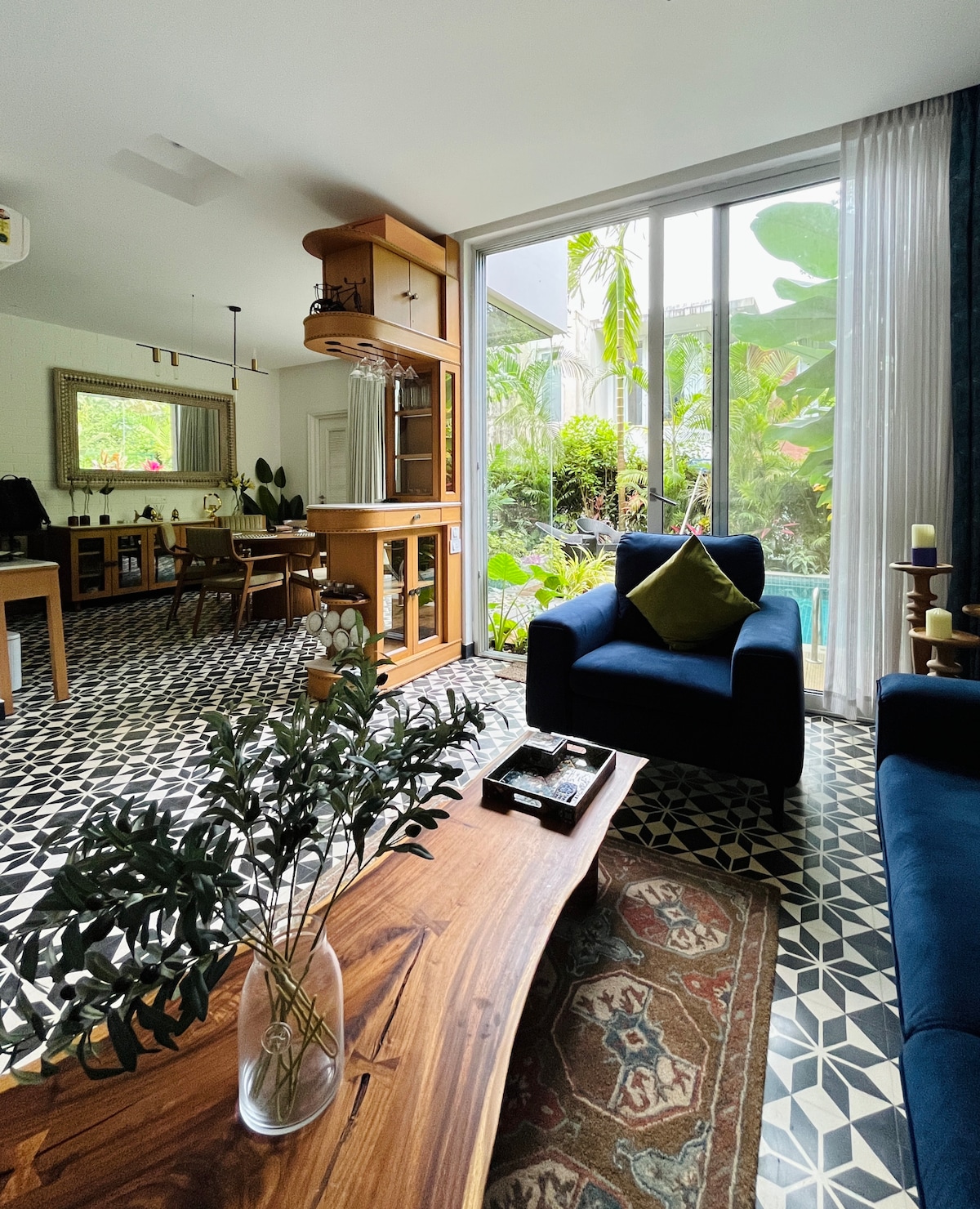 Tucked behind the main road but worlds away from the noise, this private 3-bedroom pool villa is your personal oasis in the vibrant village of Anjuna. Wake up to the sound of birds, sip coffee with butterflies passing by, and spend your evenings swimming in a private pool surrounded by trees. The villa is designed to immerse you in nature, fresh air, flora and fauna included.