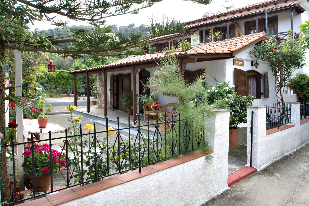 Villa ANTIGONI' welcome you at beautiful SKIATHOS. It situated at Achladies beach, 10 minutes from the skiathos town. Villa antigoni is a house with autonomous courtyard and can host till four people. It has a sleeping room a living room,kitchen and wc . The distance from the beach is 20 meters . Close by there are restaurants,bars, tavernas , pizzeria, super market, bus station and small boats which take you to skiathos town