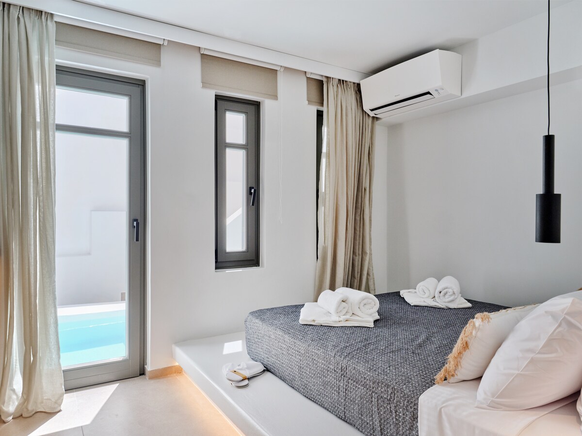 • Private plunge pool with sea & town views • Quiet location, 5-minute walk to Naousa centre • Modern Cycladic design with thoughtful details White Cliff Naousa offers a beautifully designed accommodation with authentic Cycladic touches, set in a peaceful spot just minutes from the lively centre of Naousa. Guests can easily reach restaurants, cafés and shops, or unwind at the property while enjoying the plunge pool, sea views, sunset colours and unforgettable sunrises.
