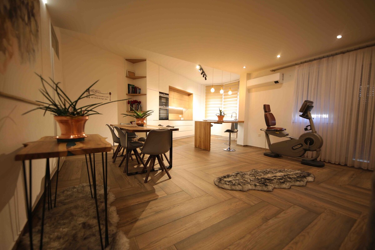 Uma amostra cosmopolita do estilo tradicional de fazenda albanesa em um apartamento de designer recém-renovado no 8º andar (com elevador), moldado com móveis de estilo rural tradicional, artefatos restaurados, lareira de mosaico espetacular e sofra criado por um artista local. Central, mas tranquilo. A peça central é um lounge/cozinha muito espaçoso que combina conforto moderno com características de um oda (o quarto principal para socializar em casas rurais tradicionais albanesas). Anfitriões que falam inglês, albanês e sérvio