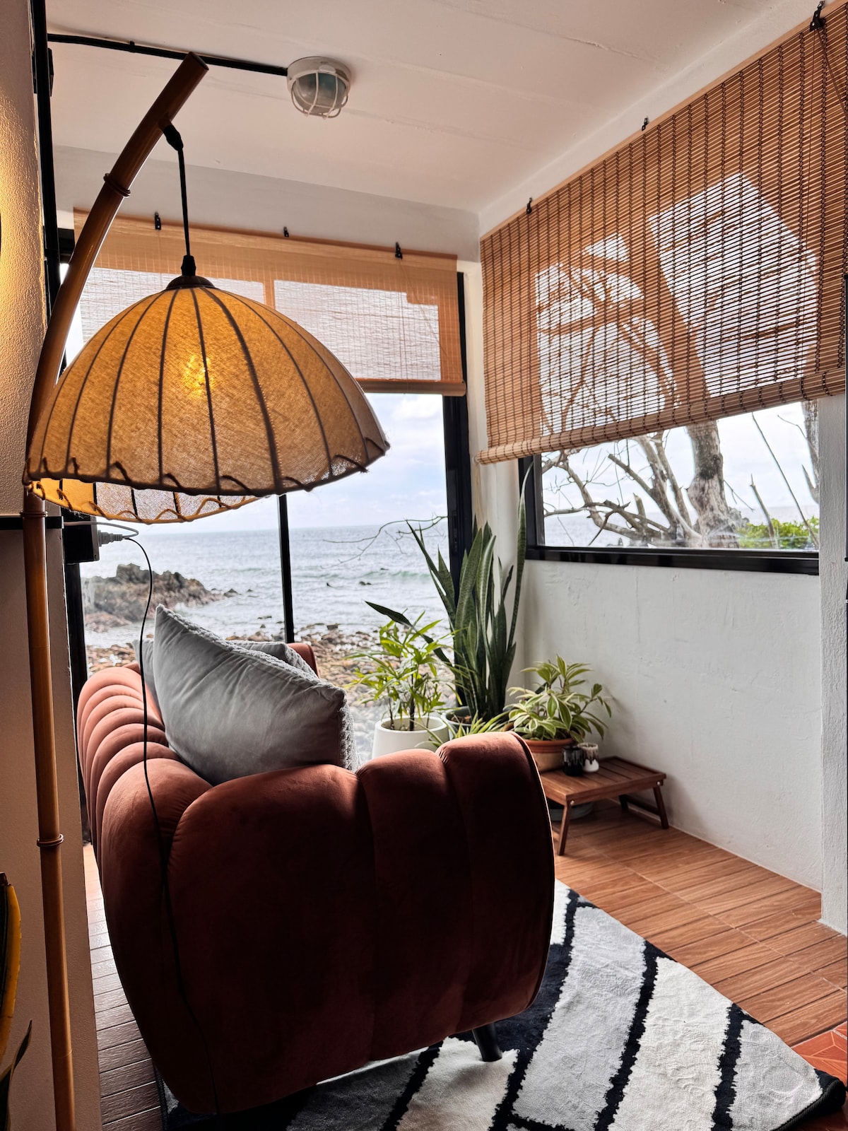Bangalô novinho em folha à beira-mar, com uma grande varanda e sala de ar-condicionado com grandes janelas de vidro com vista incrível para o mar.