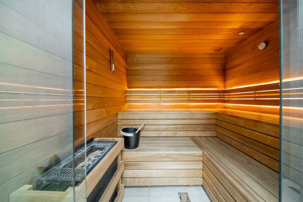 Relaxe em um apartamento luxuoso com jacuzzi e sauna