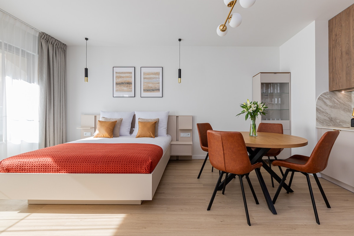 Apartamentos elegantes, totalmente equipados para garantir uma estadia confortável e relaxamento total. Oferecemos aos nossos clientes apartamentos exclusivos, preparados com atenção ao menor detalhe. Cada apartamento está equipado de forma a garantir conforto durante o descanso - camas confortáveis, kitchenette totalmente equipada, RTV moderno e eletrodomésticos, casa de banho privativa com toalhas e um conjunto de cosméticos.
