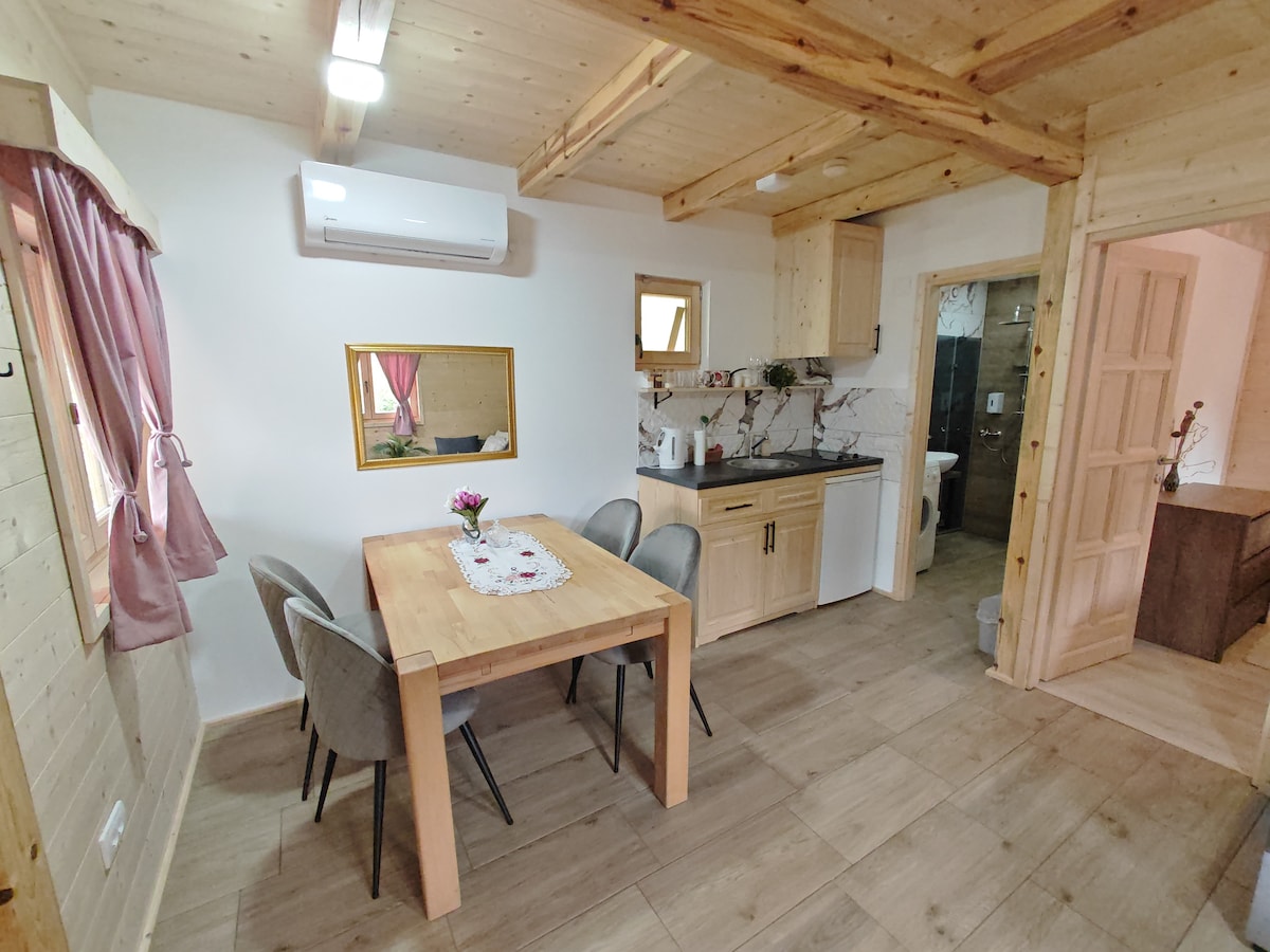 Relaxe e relaxe neste espaço tranquilo e elegante. Esta casa de madeira na montanha oferece vistas deslumbrantes nas montanhas de Mokra Gora, nos limites do Parque Nacional de Tara. Desfrute da paz e tranquilidade da bela paisagem enquanto ainda está perto de todas as comodidades e atrações. A casa de campo tem uma sala de estar aconchegante com uma cozinha em plano aberto, um banheiro e dois quartos no andar de cima. Do lado de fora, há um terraço coberto com vista para a montanha, e a casa oferece muito espaço e privacidade.
