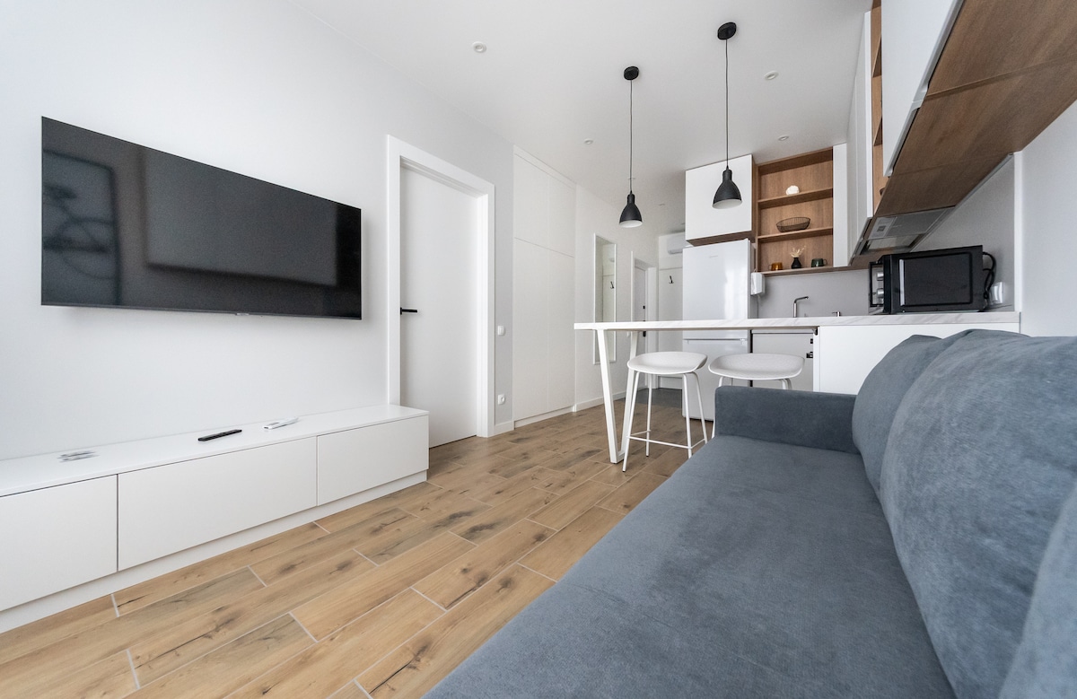 Hi there! My name is Julia and I am excited to welcome you at my brand-new designer apartments (32 sqm) in Kiev. I am pleased to share with you this stylish contemporary apartment features an open-concept layout, wood surfaces, and tasteful decor. Here you can find everything you might need for your stay - high quality bed linen, hairdryer, iron, bath accessories and more. Feel free to start your day with a cup of a lovely coffee or tea of your choice as a compliment for your stay. Welcome home!