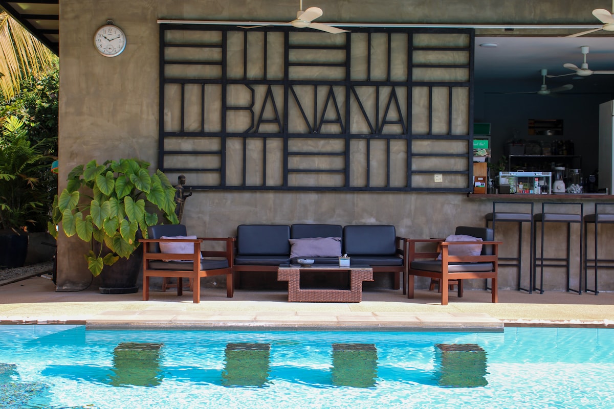 Banana Villa Siem Reap é uma propriedade tropical de 6 villas, totalmente equipadas e independentes umas das outras. Cada villa tem 2 quartos com banheiros privativos, sala de estar e cozinha. Grande piscina comunitária com 6 villas e jacuzzi cercada por mangueiras e bananeiras. Mesa de pingue-pongue, trampolim, bilhar, balanço... Localização ideal, tranquila, só os pássaros podem acordar de manhã e ainda a apenas 5 minutos no centro da cidade de Tuktuk; 15 minutos a pé do mercado antigo.