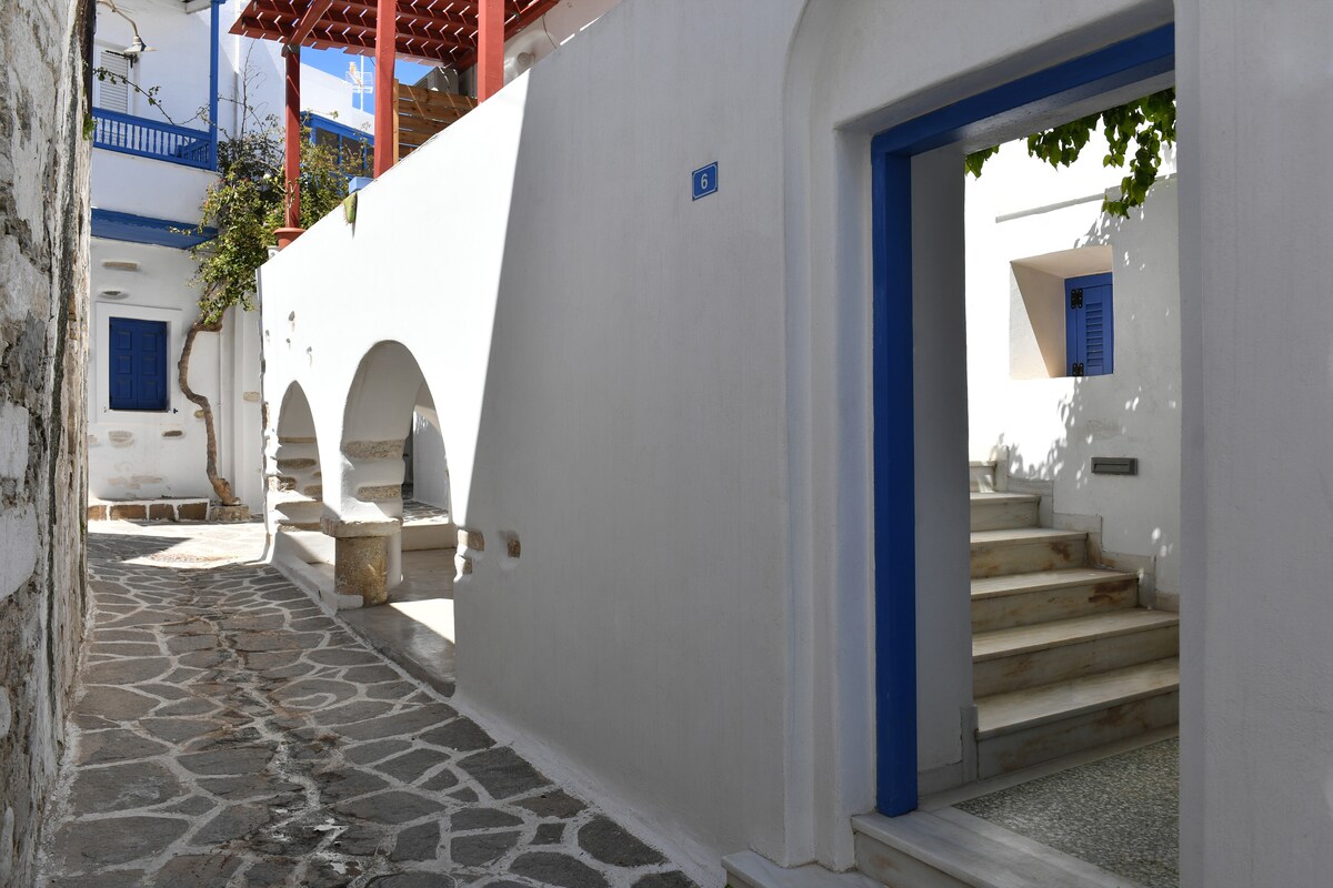 A super comfy, central loft for 2-3 in the heart of the old settlement of Parikia village, just 5 mins walking from the port and the beach! You are in the middle of the vivid night life but in a quiet picturesque alley! Our Central Loft has WiFi, A/C, washing machine, and a fully equipped kitchen with 2 electric plates for cookin. It can accommodate 3 guests in one double bed in the "attic" and one single bed in the living area. Enjoy Paros day and night life from inside!!