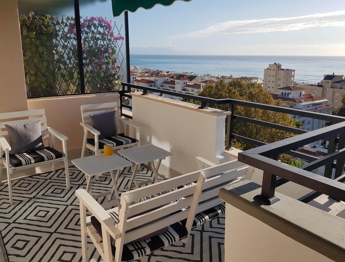 Este loft tem uma vista deslumbrante para o mar e as montanhas e está decorado com bom gosto. Uma unidade de espaço que permitirá que você admire o mar de todas as áreas. Localizado em uma área residencial verde tranquila com belos jardins e uma piscina. Você pode desfrutar do conforto e da conveniência de um enorme terraço privativo, um lugar perfeito para relaxar! Descendo a colina (bastante íngreme) você chegará à praia de La Carihuela com muitos restaurantes e lojas. A estação de trem fica a uma curta caminhada de distância e do outro lado da estrada.