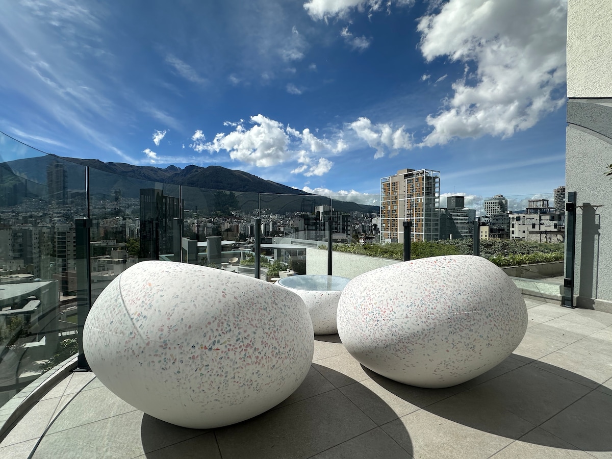 Cama king size, colchão e travesseiros novos e confortáveis, lençóis super macios. Duas TVs gigantes, eletrodomésticos novos PISCINA aquecida, sauna, banho turco e hidromassagem. Impressionante vista 360 do terraço, áreas para trabalho, descanso e recreação (devido a quedas de energia, está sujeito a disponibilidade) Setor privilegiado e seguro, com acesso a transporte. Fica a 5 minutos do teleférico, a 20 minutos do CENTRO HISTÓRICO, a 45 minutos da Metade do Mundo, a 2,4 km da Carolina
