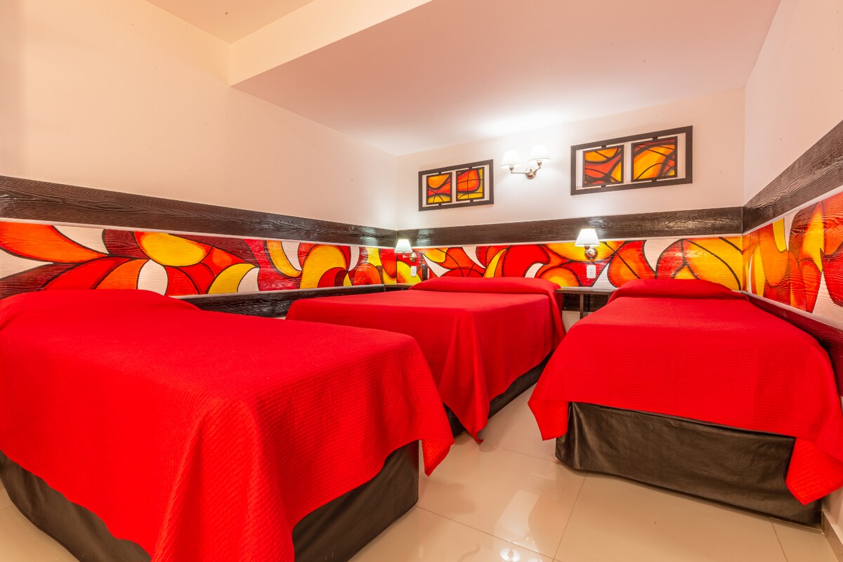 O apartamento triplo do Hotel Calimera tem todas as comodidades e facilidades para um descanso perfeito. Em seus ambientes espaçosos, dispõe de uma cama sommier de casal e uma cama sommier de solteiro, banheiro com chuveiro, ar condicionado, cozinha completa, geladeira, micro-ondas e louça, televisão LED de 32", aquecimento, telefone, cofre, serviço de quarto e Wi-Fi. Além disso, todos os dias estão incluídos o serviço de café da manhã e limpeza do quarto!