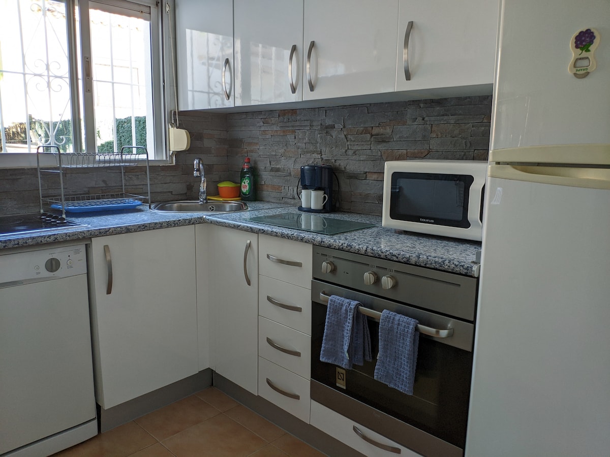 Bangalô com churrasqueira e pequeno jardim, ideal para animais de estimação. Tem 2 quartos, uma cama de casal e uma cama de solteiro. Banheiro com chuveiro, sala de estar e jantar, cozinha equipada, máquina de lavar louça, forno e máquina de lavar roupa. Tem uma piscina comunitária, WI-FI (600 MB), ar condicionado e aquecimento. TV satélite (Astra 1, 2 & Hotbird) (ENG, IT, International) A 5 km de Benidorm, estacionamento fácil, área e empreendimento tranquilo a 20 minutos a pé da praia de Albir. Animais de estimação são permitidos.