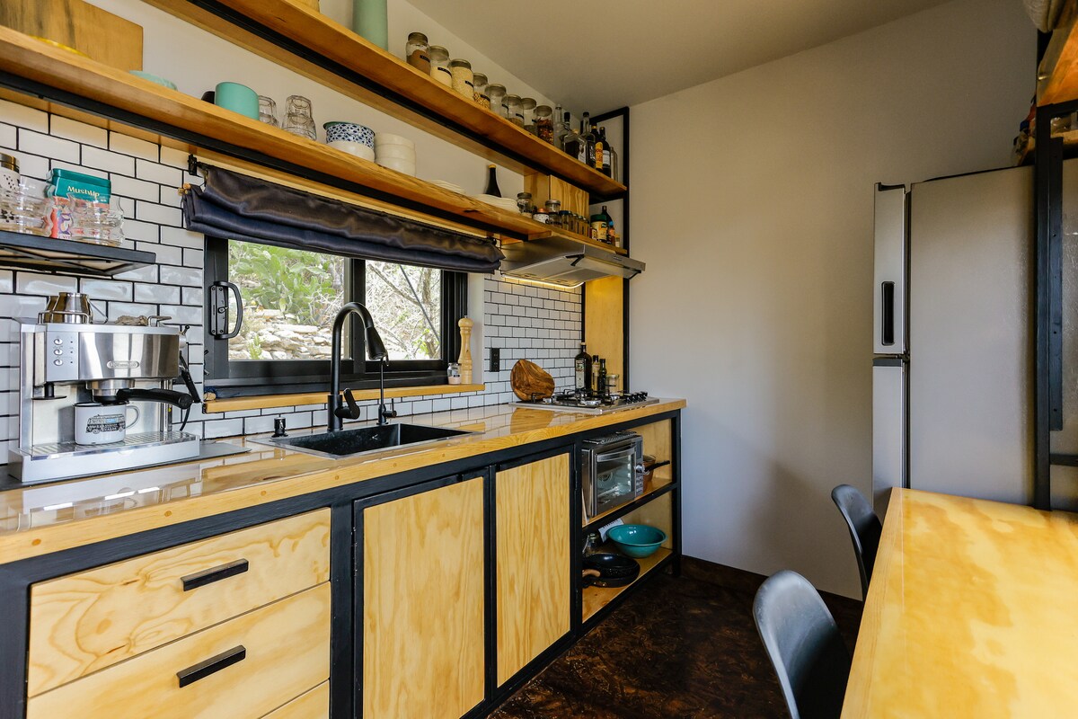 Casa de contêineres única, moderna e funcional. A 15 minutos do centro histórico, ao lado do Parque Sahuatoba. Monoambiente com cama queen size, sofá-cama, banheiro privativo, TV, Wi-Fi de fibra óptica e mini cozinha equipada. Desfrute de uma fogueira, uma churrasqueira, uma mesa de jardim e uma pia. Relaxe na jacuzzi para 4 pessoas com chuveiro externo. Ideal para escapadas tranquilas, sair com seu parceiro, design criativo e conexão com a natureza.