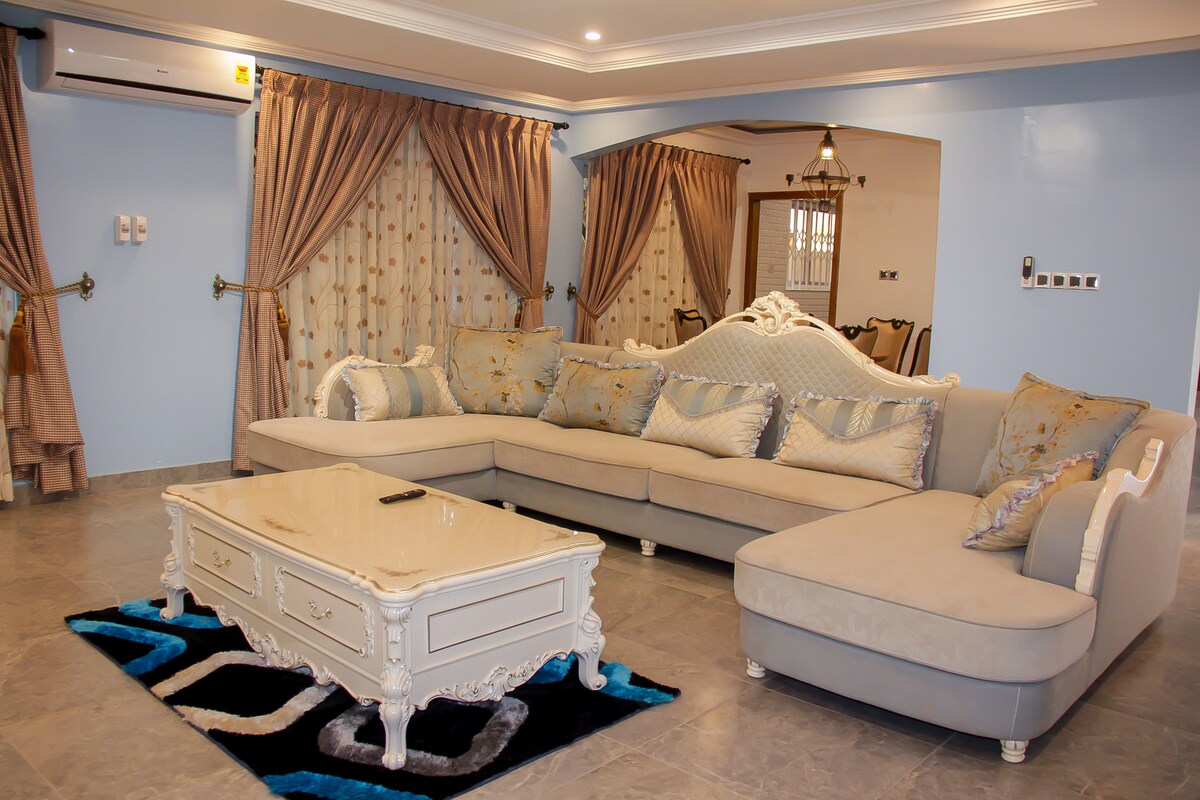 Fuja e relaxe com toda a família neste lugar tranquilo, em KAS Valley Estate, Oyibi, a apenas 20 km do aeroporto. Propriedade aconchegante que oferece vistas serenas e bonitas da colina. Desfrute de uma escapadela relaxante de fim de semana com todos os confortos únicos. Reserve sua estadia hoje e experimente um verdadeiro conforto com seus entes queridos. Principais recursos: •Quartos com ar-condicionado •Wi-Fi gratuito para estadias curtas • Backup de energia solar •DStv para entretenimento • Backup aquático •Academia e piscina • Estadias longas disponíveis • Exclusivo para uso dos hóspedes