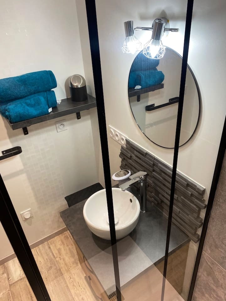 Estúdio independente no térreo, recente (2023) com banheiro e vaso sanitário separado. Você pode desfrutar do jardim cercado de 500m2 com espreguiçadeiras, área sombreada para refeições ao ar livre. Aqui, nós amamos animais e você é bem-vindo com cachorro, gato, camelo. Totalmente equipado com cama real com colchão Bultex confortável e cozinha completa com geladeira, indução, cafeteira e chaleira. Roupa de cama e toalhas fornecidas. Máquina de lavar roupa por € 5, detergente incluído.