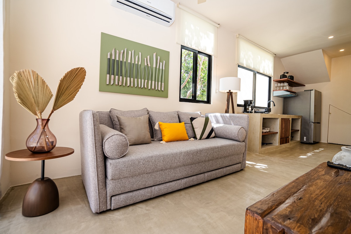Charm and comfort await you in this modern studio for 4 (2 adults and 2 small children) in Tulum. Ideal for families or friends, it offers an equipped kitchen and a living room with a short sofa bed. Its prime location allows you to easily explore the dreamy beaches and local culture. Enjoy amenities such as Wi-Fi, a cinema, access to 2 refreshing pools and a gym. Live an authentic experience, surrounded by nature, without sacrificing comfort. Your perfect getaway in paradise.