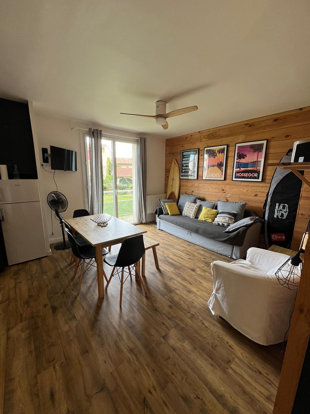 BIEN LIRE pour BIEN CHOISIR ! La casita :T1 bis simple, claire et ressourçant avec l'énergie du bois associée aux couleurs terre, la vieille planche de surf de famille en prime ! 20 m2 : salon avec canapé lit/kitchnette +1 chambre et 1 SDB baignoire 140 cm. Espace extérieur. Table et 2 chaises. Cadre paisible avec lac à 50 mètres à pied, et océan à 10 /12 minutes à vélo /5 minutes en voiture. Emplacement entre Bayonne et Hossegor. (Ni en ville, ni sur l’océan ) Idéal à 2, appoint pour +