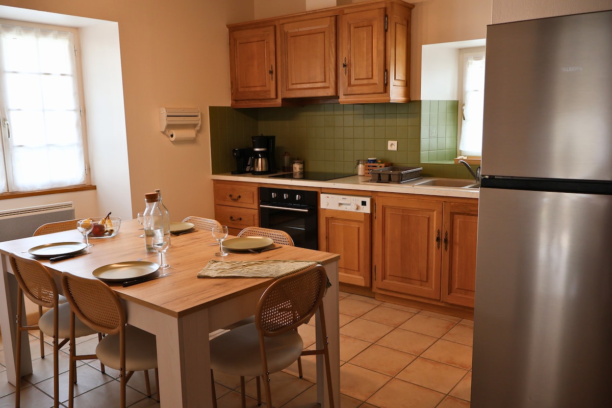 Acomodação localizada no térreo da casa dos proprietários, composta por 3 quartos (2 quartos com 1 cama de casal e 1 quarto com 2 camas de solteiro). Possibilidade de cama de bebê. Uma cozinha equipada (fogão a gás, forno, geladeira, cafeteira Senseo, máquina de lavar louça) Sala de estar completa o conjunto, onde você encontrará jogos de tabuleiro para jogar com a família ou amigos. Do lado de fora, você pode desfrutar do mobiliário de jardim, enquanto ouve o som relaxante da água corrente, e da piscina aquecida.