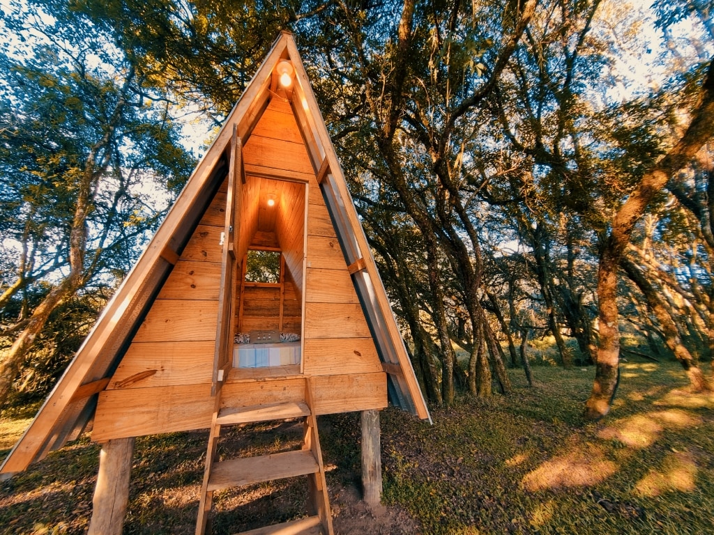 Cabana Água é para quem busca desacelerar e relaxar. Mini cabana A-frame simples em meio à natureza, de frente para o rio e área para fogueira. Colchão de casal e ambiente acolhedor. Não possui banheiro interno: há banheiros compartilhados (externo e na cozinha). Cozinha comunitária com lareira, churrasqueira externa e natureza ao redor. Importante: no momento, não disponibilizamos roupas de cama, cobertas e toalhas. Os hóspedes devem trazer esses itens para a estadia.