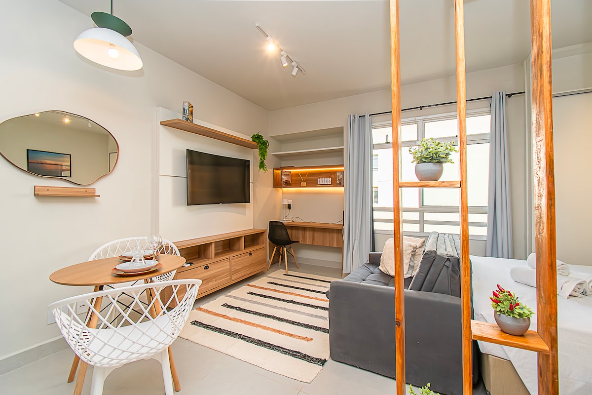 Agradável Studio, quarto/sala/cozinha, banheiro, com box espaçoso, varanda com mesa para refeições, cama box Queen, armário e comoda para roupas, espaço exclusivo de trabalho, Wi-Fi com 390Mbps. Roupas de cama e banho, TV LCD 32" a cabo NET com múltiplos canais, Netflix, frigobar, micro-ondas, forno elétrico, cafeteira elétrica, sanduicheira, fogão eletrico de uma boca, liquidificador, ferro e tábua de passar roupas, ar condicionado Split. Studio seguro em prédio familiar.