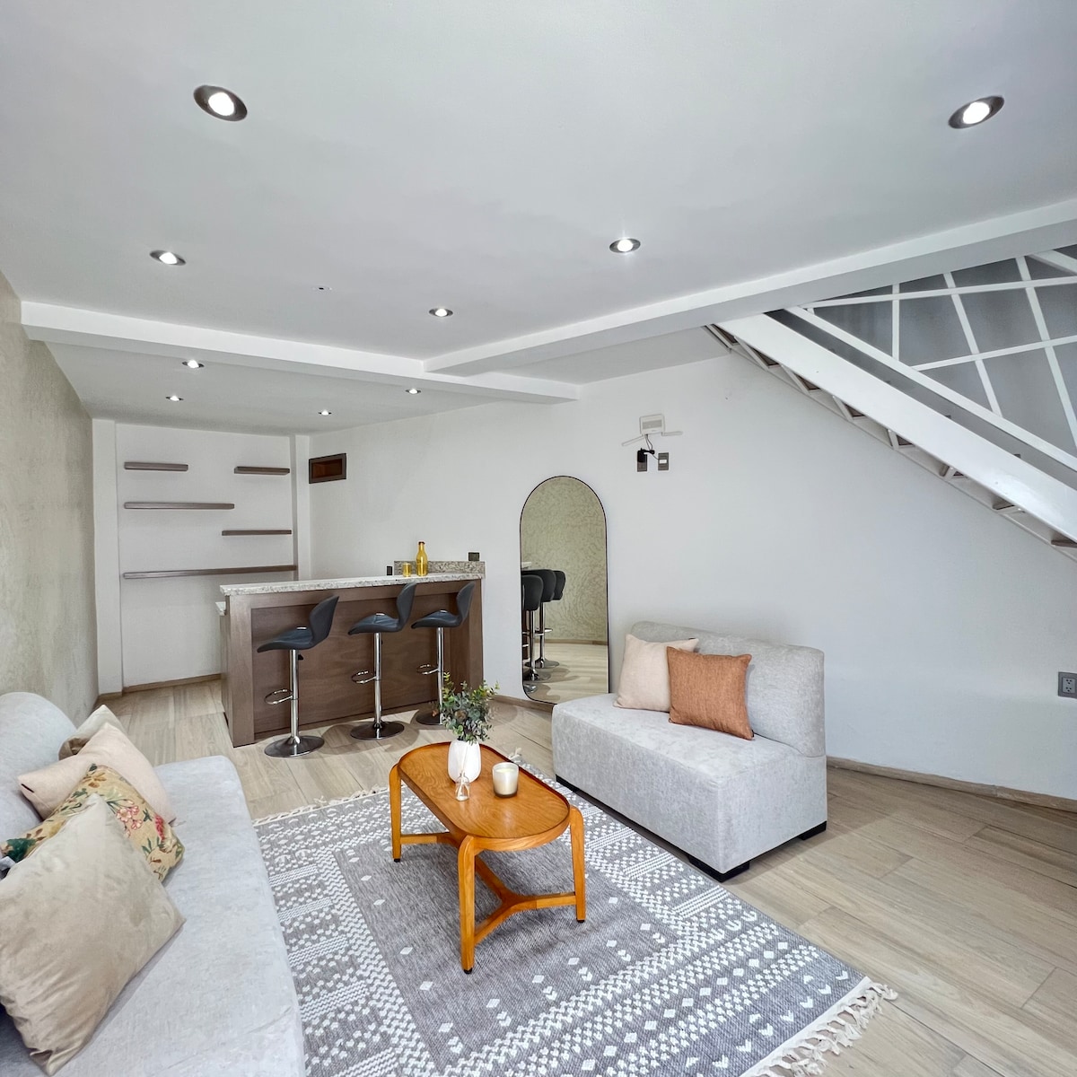 Apartamento completo aconchegante na aldeia mágica de Lagos de Moreno: Perfeito para compartilhar, viver juntos e ter momentos alegres com seu parceiro, amigos ou familiares. Um lugar cheio de vida onde você terá um terraço perfeito para passar a noite. Sua localização permite que você acesse facilmente o centro histórico, todas as estradas e também fica em frente a um belo jardim, com todos os tipos de lojas nas proximidades, incluindo uma loja de bebidas que fecha tarde.