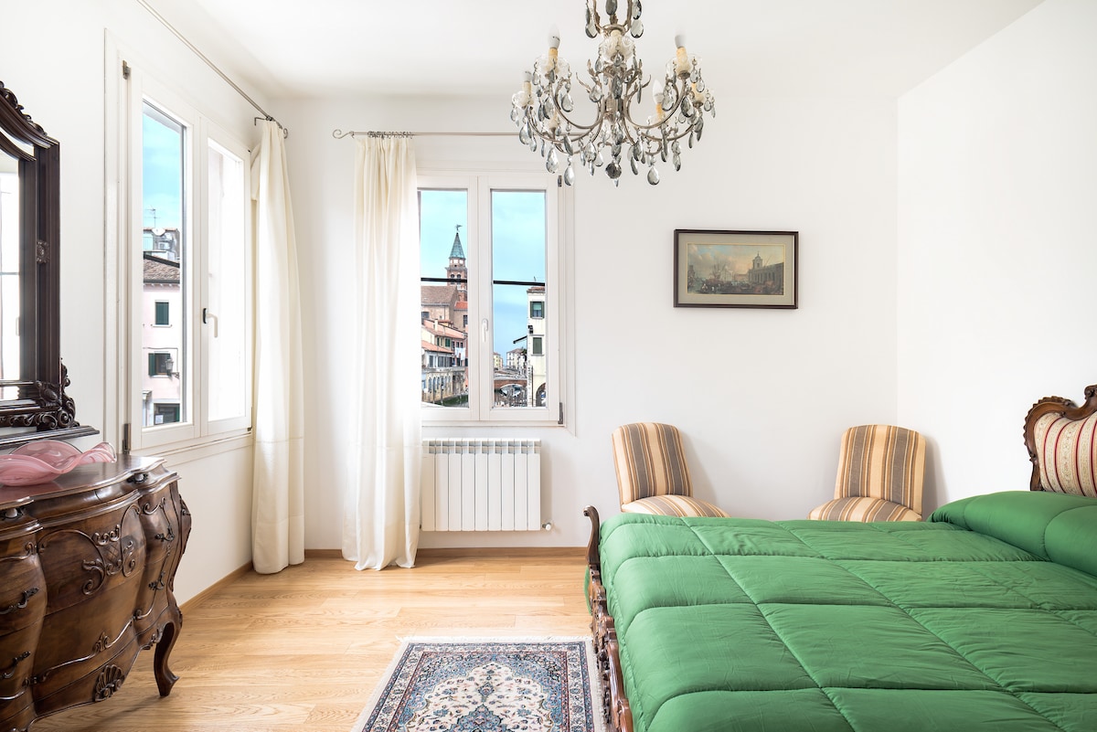 Um apartamento inteiro com uma decoração de estilo veneziano, em um palácio privado de 1600, com uma VISTA DESLUMBRANTE. Situado no 1º andar, o apartamento tem um quarto grande com uma cama queen size. O banheiro é espaçoso e equipado com um grande chuveiro. A cozinha está totalmente equipada com uma geladeira, torradeira, chaleira e uma máquina Nespresso. A entrada se abre para uma área de estar muito grande com vista para o canal, onde você pode sentar e basicamente tocar a água enquanto desfruta de uma taça de vinho.