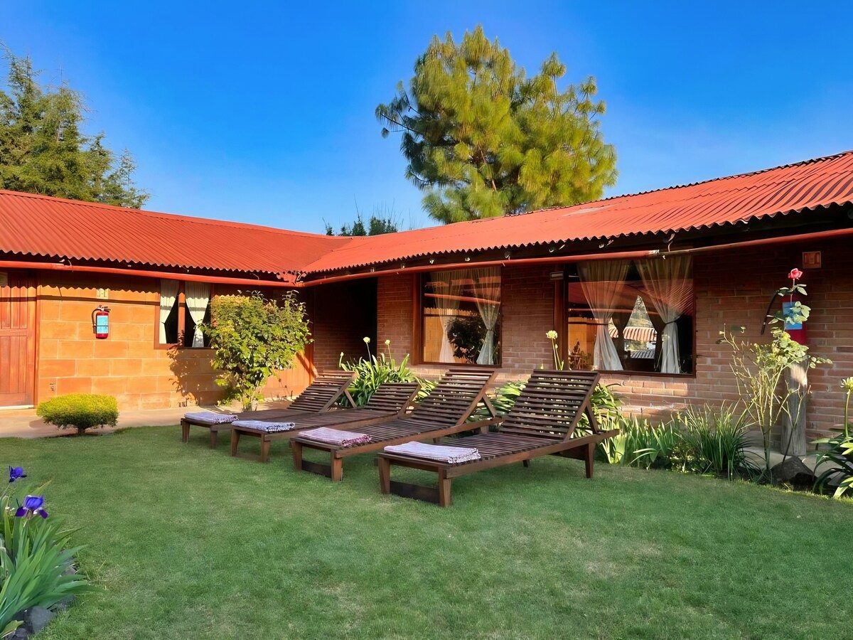 Relaxe com sua família nesta bela acomodação cercada por floresta, onde a tranquilidade é respirada em cada canto. Desfrute de uma pista de bicicleta, jacuzzi, campo de futebol, cinema ao ar livre, palapa com lareira e serviço de cozinha com produtos locais. Tudo a apenas 20 minutos do centro da cidade de Valle de Bravo. Fique em Encino, nossa acolhedora casa de campo de dois andares com uma sala de estar, banheiro privativo e um terraço com vista para a floresta no térreo; e mezanino com uma cama king size.