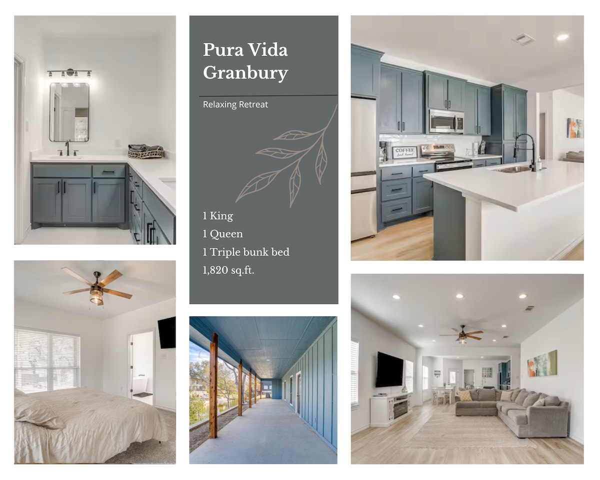 Fuja para este retiro relaxante, elegante e que aceita animais de estimação em um bairro de campo de golfe perto do Lago Granbury. Desfrute de um nascer do sol deslumbrante, noites aconchegantes junto à fogueira e um espaço loft divertido. Localizado a apenas 1,5 km de um lançamento público de barcos, há espaço para estacionar seu reboque de barco. Explore o centro histórico de Granbury, repleto de lojas, restaurantes, vinícolas e entretenimento. Perfeito para casais, famílias ou amigos, este refúgio moderno combina conforto, charme e conveniência. Reserve sua estadia hoje!