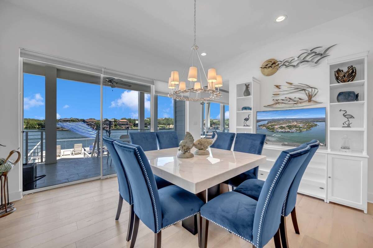Um dia na vida em Paradise Point Desfrute de vistas deslumbrantes para o lago de todos os ângulos em Paradise Point, uma casa de luxo de 3 andares em um condomínio fechado. Passe o dia andando de bicicleta, relaxando na piscina privativa (e aquecível) ou grelhando na cozinha ao ar livre. Aproveite o pôr do sol no deck de entretenimento e, em seguida, retire-se para quartos espaçosos no andar de cima. Com um ancoradouro, brinquedos aquáticos, pingue-pongue e muito mais, esta casa é perfeita para famílias ou amigos que procuram diversão em Hill Country e relaxamento à beira do lago.