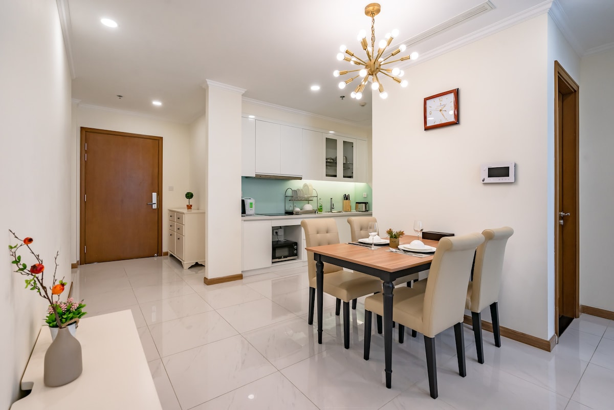 Bem-vindo ao Landmark 4 – Apartamento moderno de 2 quartos - Estiloso: 2 quartos espaçosos com camas queen size - Comodidades completas: 2 banheiros, toalhas limpas, cozinha totalmente equipada, máquina de lavar roupa, ar condicionado e Wi-Fi. - Conforto: sala de estar aconchegante com sofá e TV, perfeita para relaxar depois de explorar a cidade. - Conveniência: acesso ao elevador e 24h. - Localização privilegiada: no Landmark 4 – ao lado do Landmark 81, cercado pelo Vincom Center, parque à beira-rio, restaurantes e cafés. Acesso fácil ao Distrito 1 em apenas 10–15 minutos.