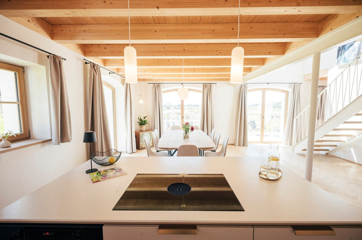 El Bohio é um apartamento em dois andares em nossa BogenVilla, uma fazenda mencionada pela primeira vez em 1260, que temos reformado com carinho desde 2019. A varanda com vista para os nossos jardins e prados permite que você relaxe. Localizado entre Haag na Alta Baviera (6 km) e Wasserburg am Inn (11 km), Munique (45 km) e o Lago Chiem (38 km) também estão próximos. Seus anfitriões Kirsten (de Porto Rico) e Marc (de Berlim) moram na BogenVilla e estão sempre à sua disposição.