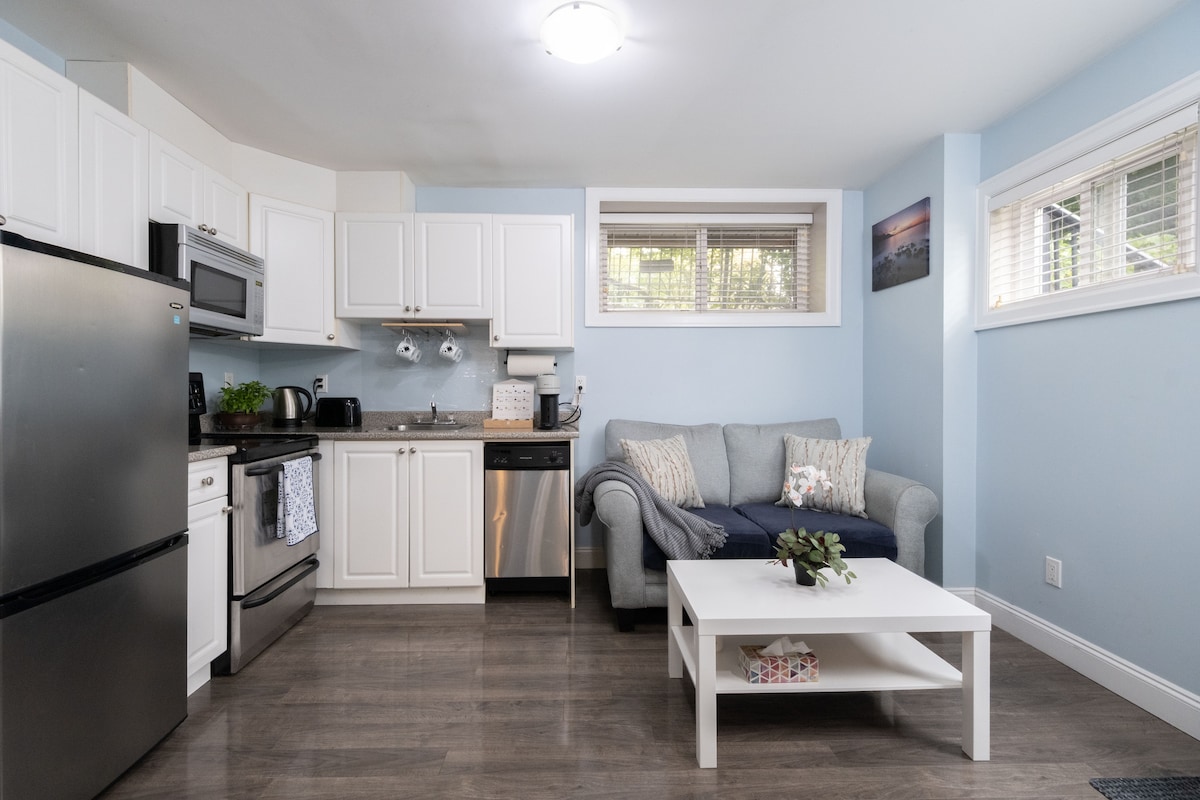 Recém-reformado 600 pés quadrados de conforto aconchegante e luminoso. Decoração estilo praia para você entrar no modo de férias com a sensação de estar em casa longe de casa. Perfeito para negócios ou lazer. WIFI 5G incluído. TV a cabo Telus, Netflix, Prime, Disney e Apple incluídos. Cozinha privativa totalmente equipada com máquina de lavar louça. 1 quarto com cama tamanho queen e colchão novo de luxo de alta qualidade + novo sofá-cama de casal na sala de estar. Lavanderia na suíte com detergentes incluídos. Estacionamento na rua bem iluminado, escadas até a entrada.