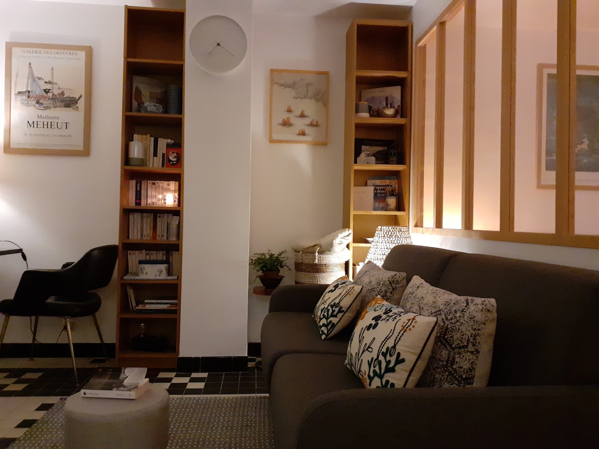 Lindo apartamento totalmente equipado, de 41 m² com terraço de 15 m² sem vizinhos, localizado em uma rua sem saída tranquila. Composto por uma sala de estar com um sofá-cama de dois lugares, um quarto com uma cama de 140 x 190, e um banheiro com um chuveiro. Todos os comércios estão próximos (farmácia, padaria, açougue, supermercado, peixaria, cinema...). A 5 minutos de carro das praias, do GR, das atividades náuticas. Alojamento acessível sem escada, estacionamento, máquina de lavar, wi-fi, máquina de lavar louça.