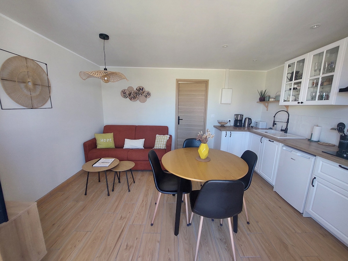 Tiny house située sur un terrain privé, tout près du GR 34 ,sur la commune de Lanmodez. Elle est composée d'une cuisine équipée, d'une salle de bain avec douche et toilettes sèches. Pour le couchage, il y a une mezzanine pour 2per et une seconde pour 1 enfant, et une banquette convertible. A l'extérieur, une terrasse avec un salon de jardin ,un barbecue et des transats .
