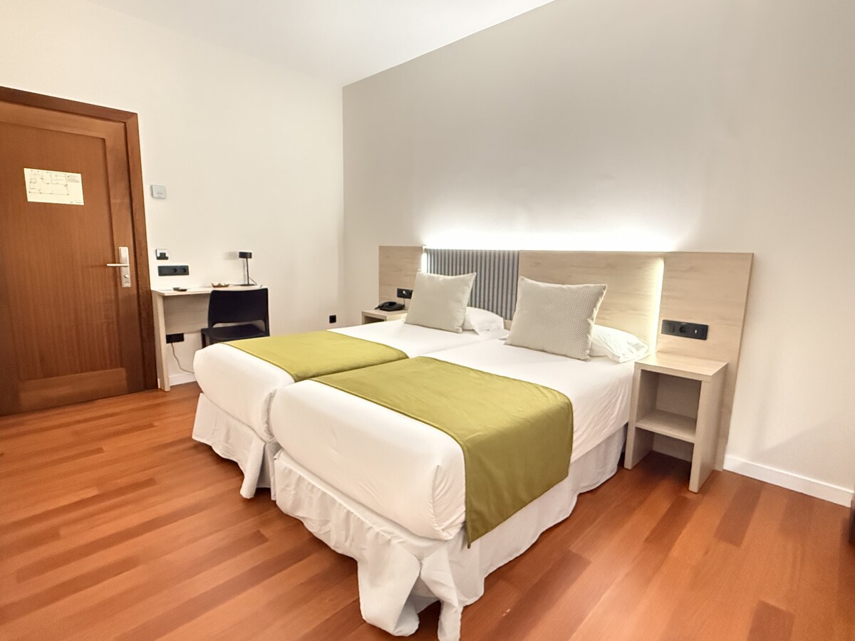 Quarto de casal com varanda Aproveite o descanso e as vistas do nosso quarto duplo com varanda. Seu espaçoso terraço, equipado com mesa e duas cadeiras, é ideal para relaxar enquanto contempla as belas vistas da piscina e/ou campo de golfe. Neste quarto, você encontrará todos os tipos de comodidades, como uma mesa, Smart TV, Wi-Fi gratuito e um armário. No banheiro privativo, você terá produtos de higiene pessoal, toalhas de banho, toalhas de piscina e um secador de cabelo.