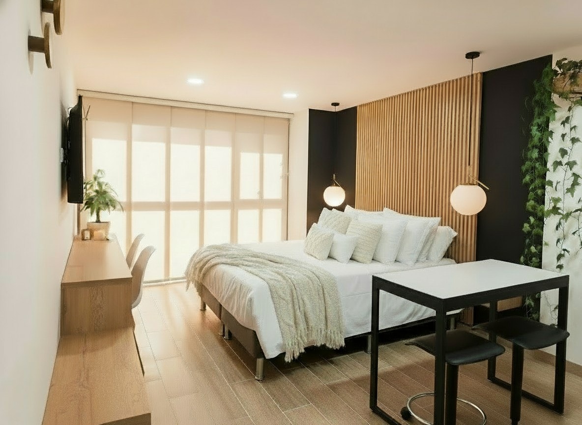 Reserve uma experiência elegante neste estúdio exclusivo de plano aberto perto do parque Lleras! - INCLUÍDO NESTE ESPAÇO - - Espaço de trabalho exclusivo com Wi-Fi de alta velocidade - Jacuzzi privada - Ar-condicionado - Estacionamento no local - Smart TV rotativa de 54" - Netflix - Cama king size de qualidade de hotel - Máquina de lavar/secar no local - Cozinha totalmente funcional - Estação de chá/café - Cortinas black-out - Sabonete para o corpo, xampu e condicionador - Academia - Sauna - Piscina - Bares, restaurantes e cafeteria no local - Galeria de arte
