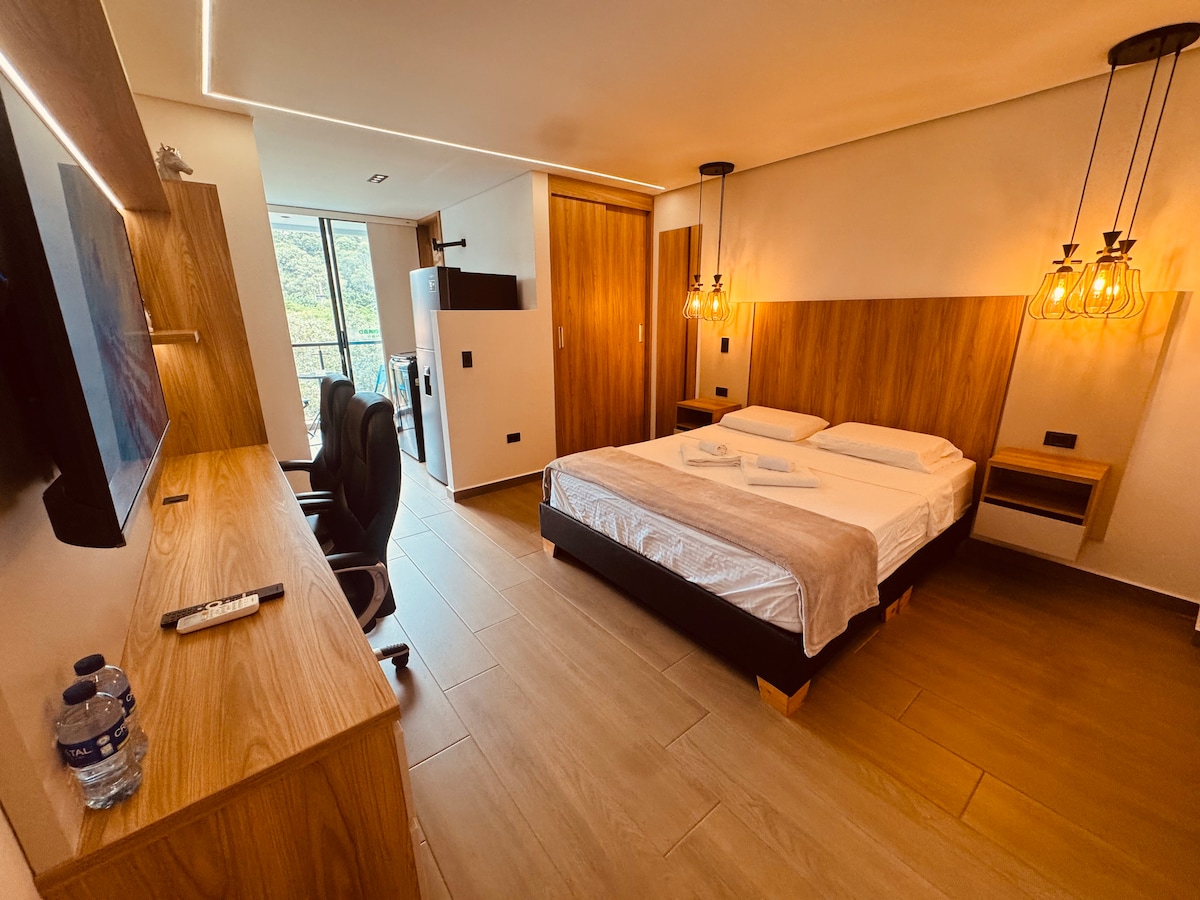 - Localização privilegiada: no coração do bairro Laureles, perto de estações de metrô, estádio, supermercados, restaurantes e da 70. - Varanda com vista para a cidade. - 2 quartos - Wi-Fi (300 Mb) de fibra óptica. - A/C - Jacuzzi. - Equipe no local 24 horas por dia, 7 dias por semana, pronta para ajudar em tudo o que você precisar. - Smart TV de 43”, com aplicativos instalados. - Cozinha equipada com louça, panelas, colheres, facas. - Cama Queen size (1,60 m x 1,90 m) - Preços transparentes (Ver Regras)