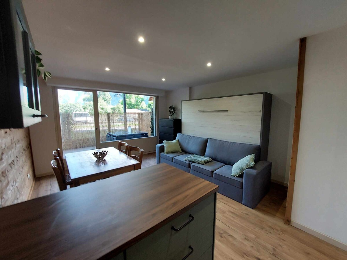 Simplifiez-vous la vie dans ce studio refait à neuf, paisible et idéalement placé.Venez profiter de sa terrasse avec vue sur la montagne. Situé au RDC, très lumineux agréable et fonctionnel grâce à ses espaces optimisés, ce studio est composé d’une belle pièce à vivre avec cuisine toute équipée, un coin montagne avec lit superposé (90×190), une belle salle d'eau avec WC. Dans la pièce à vivre le canapé se transforme facilement en lit queen size 160x200.