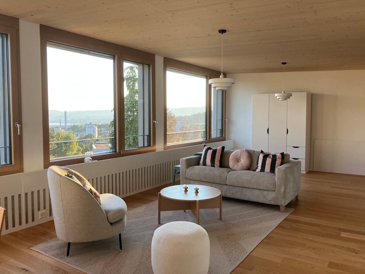 O apartamento muito iluminado, espaçoso e totalmente aberto (loft) está situado em um canto verde nas alturas de Lausanne. O design elegante e as vistas panorâmicas do lago fazem dele um objeto único. O acesso ao jardim em um terraço privativo permite que você aproveite os belos dias de verão. O centro da cidade e a estação de trem ficam a 20 minutos de transporte público, no final da rua.
