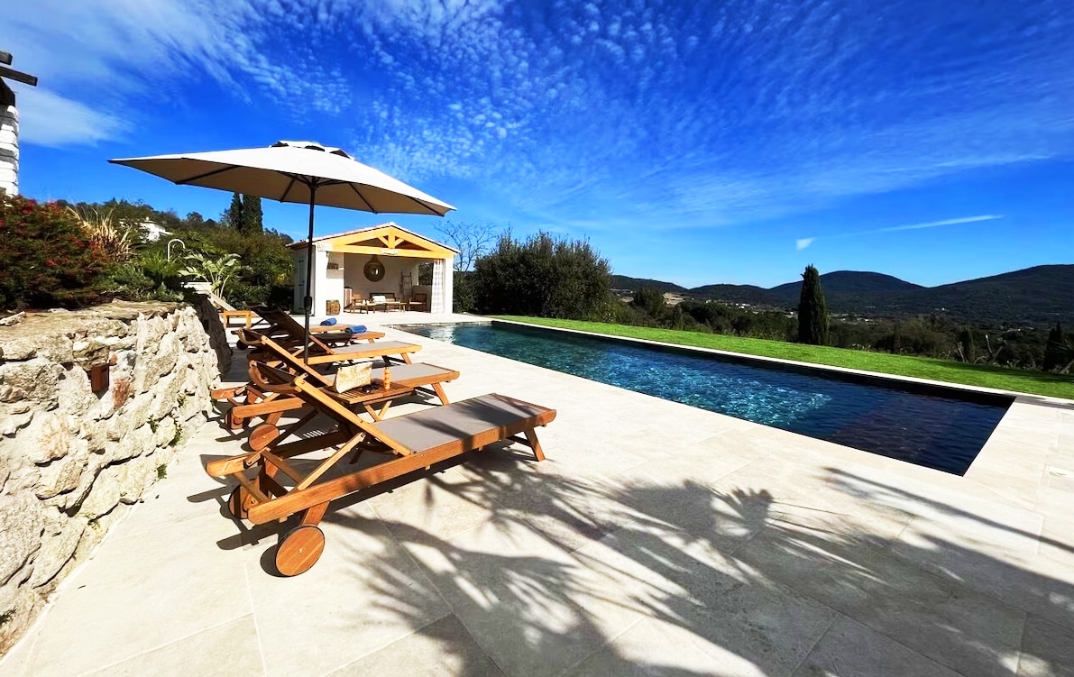 Uma bela fazenda provençal totalmente nova, na saída da encantadora aldeia do Plan de la Tour. 4 quartos, 3 banheiros, 1 grande sala de estar com sala de estar, sala de jantar, cozinha aberta com vista para um pátio ao ar livre com uma vista majestosa das colinas da Plaine des Maures. Piscina privativa, campo de petanca, tudo em uma pequena área tranquila, a 15 minutos das praias e a 10 minutos de Sainte-Maxime ou Grimaud. Férias em família, belas caminhadas, aproveite!