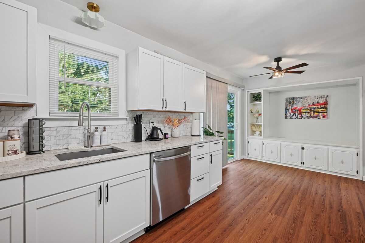 Fãs de esportes e viciados em compras vão adorar ficar nesta parte da KC para eventos durante todo o ano e ótimas compras. Da NASCAR na pista de corrida, futebol e campos de beisebol lado a lado, você está bem no meio de tudo. Compre, jante e divirta-se no The Legends com mais de 100 lojas, um Walmart para estocar suprimentos e um Starbucks para reabastecer. A casa oferece tudo o que você precisa. Decoração chique, uma cozinha gourmet totalmente abastecida, 2 quartos com camas queen size e um banheiro moderno e cintilante.