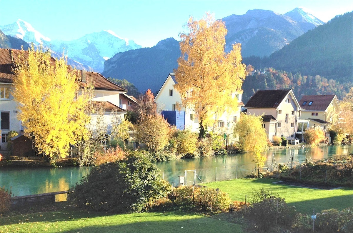 Fique no nosso apartamento loft iluminado a apenas 9 minutos de Interlaken e a 3 minutos a pé do Lago Thun. Localizado bem no centro da vila, lojas e um ponto de ônibus (para Spiez e Interlaken) estão a poucos passos de distância. O apartamento no último andar dispõe de um quarto com uma cama queen size, uma segunda cama queen size na área de estar, uma cozinha totalmente equipada, espaço para refeições, sofá confortável com TV, banheiro, máquina de lavar roupa e uma varanda com vista para a montanha. Estacionamento gratuito incluído. Perfeito para famílias, casais e amigos