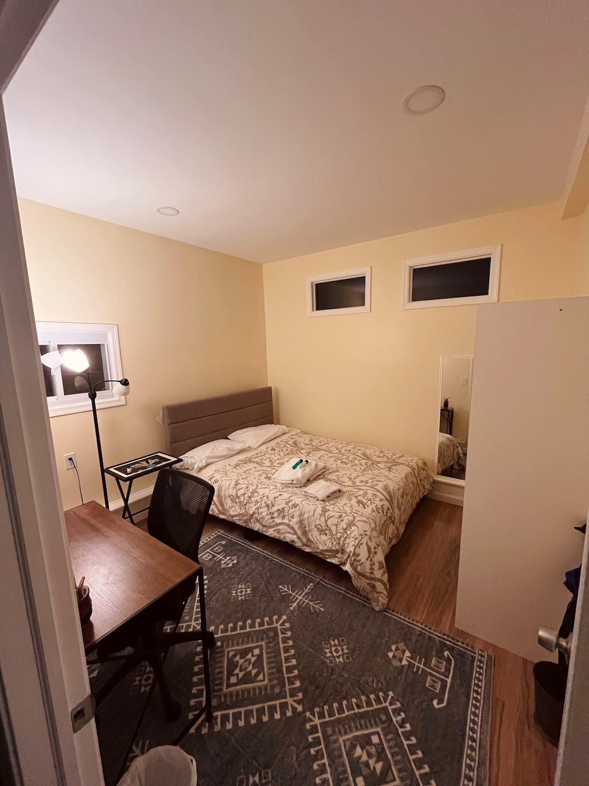 I'm pleased to share my latest design after a two year renovation project! This finished basement has been totally renovated and designed with lots of great amenities! It features secure parking, a private entrance, brand new kitchenette area and private bathroom, dedicated workspace, LOTS of windows for natural lighting, a blackout curtain in the bedroom, and the entire ceiling has been soundproofed! Extra soundproofing has been used in the bedroom for added comfort and enjoyment!