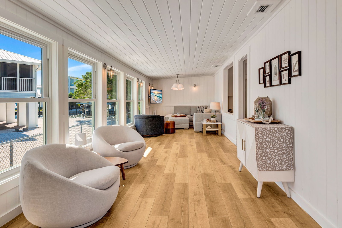 Bem-vindo ao Paradise Palms. Este 2º nível 1 BR é totalmente renovado com todos os móveis novos, grande terraço privativo e banheira de hidromassagem, quarto com cama king, sofá-cama queen size na sala de estar, lavanderia, WI-FI de alta velocidade, todos os eletrodomésticos novos, muitos armários, TVs inteligentes e ala de música. Saia pela sua porta para uma praia semi-privada e um bairro tranquilo de casas unifamiliares. Há acesso à baía também, caiaques disponíveis para alugar. Esta é uma unidade de 2º andar com outra unidade abaixo.