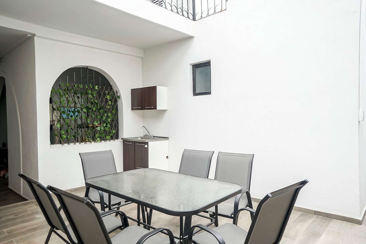 Conforto e localização perfeita em León Desfrute de um quarto moderno com uma cama king size, uma cozinha compacta totalmente equipada (cooktop de indução, frigobar, micro-ondas, cafeteira e pratos), closet, TV, ar-condicionado e banheiro privativo. A casa também oferece uma área de coworking e um terraço com churrasqueira, perfeita para trabalhar ou relaxar. Localizado perto do Estádio León e do Poliforum, é ideal para viagens de negócios, eventos ou uma estadia relaxante. Reserve conosco e aproveite uma experiência inesquecível!