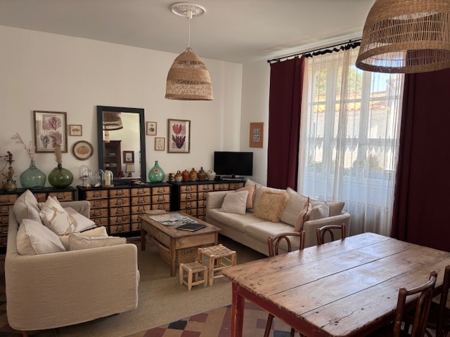 Descubra esta casa renovada com bom gosto, convenientemente localizada a apenas 6 minutos de bicicleta do mar, perfeita para relaxar como casal. Mergulhe no conforto de uma casa totalmente equipada, com uma cozinha moderna com um Thermomix, uma sala de jantar para 8 pessoas, se você quiser hospedar, e um quarto espaçoso com uma cama 160x200 e um projetor de vídeo para noites de cinema.